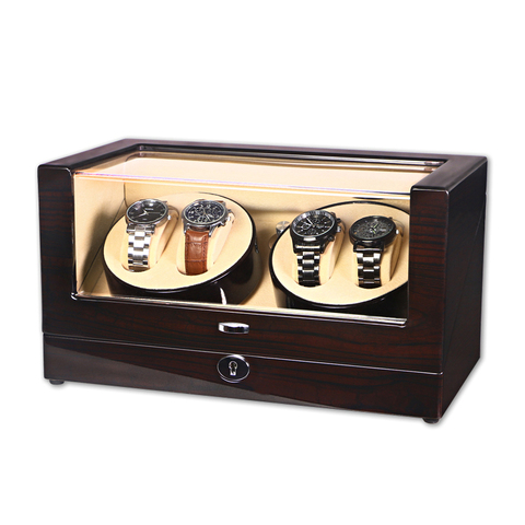 Luxe 4-Slot Horloge Winder Stille Motor Lak Hout Roteren Elektrisch Horloge Koolstofvezel Pu Glas Luxe Us Plug Horloge Display